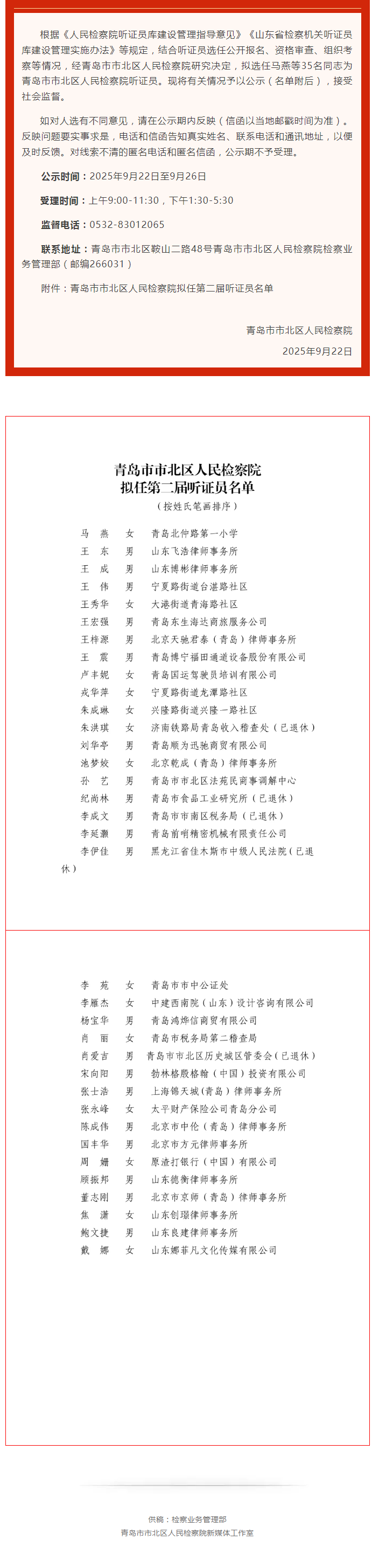 青岛市市北区人民检察院第二届听证员拟任人选公示